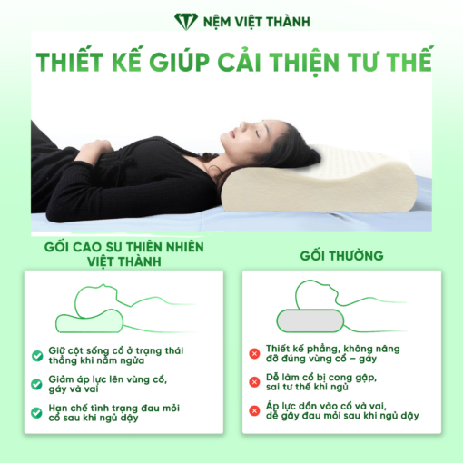 Gối nằm cao su thiên nhiên gợn sóng Việt Thành được thiết kế công thái học giúp nâng đỡ vùng cổ và đầu một cách tự nhiên, mang lại cảm giác êm ái và thoải mái khi ngủ. Sản phẩm sử dụng 100% cao su thiên nhiên cao cấp, có độ đàn hồi tốt, thoáng khí và bền bỉ theo thời gian.