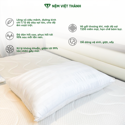 Gối nằm lông vũ Việt Thành là lựa chọn lý tưởng cho những ai muốn nâng cấp giấc ngủ với một chiếc gối mềm mại, thoáng mát và bền bỉ.
