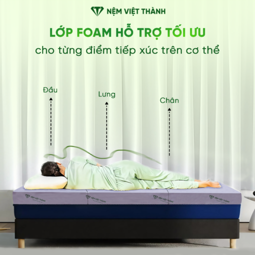 Lõi foam hoạt tính đàn hồi tốt giúp nệm ôm sát đường cong tự nhiên của cơ thể, phân bổ lực đều tại các vùng vai – lưng – hông, từ đó giảm áp lực và hạn chế đau mỏi khi ngủ.