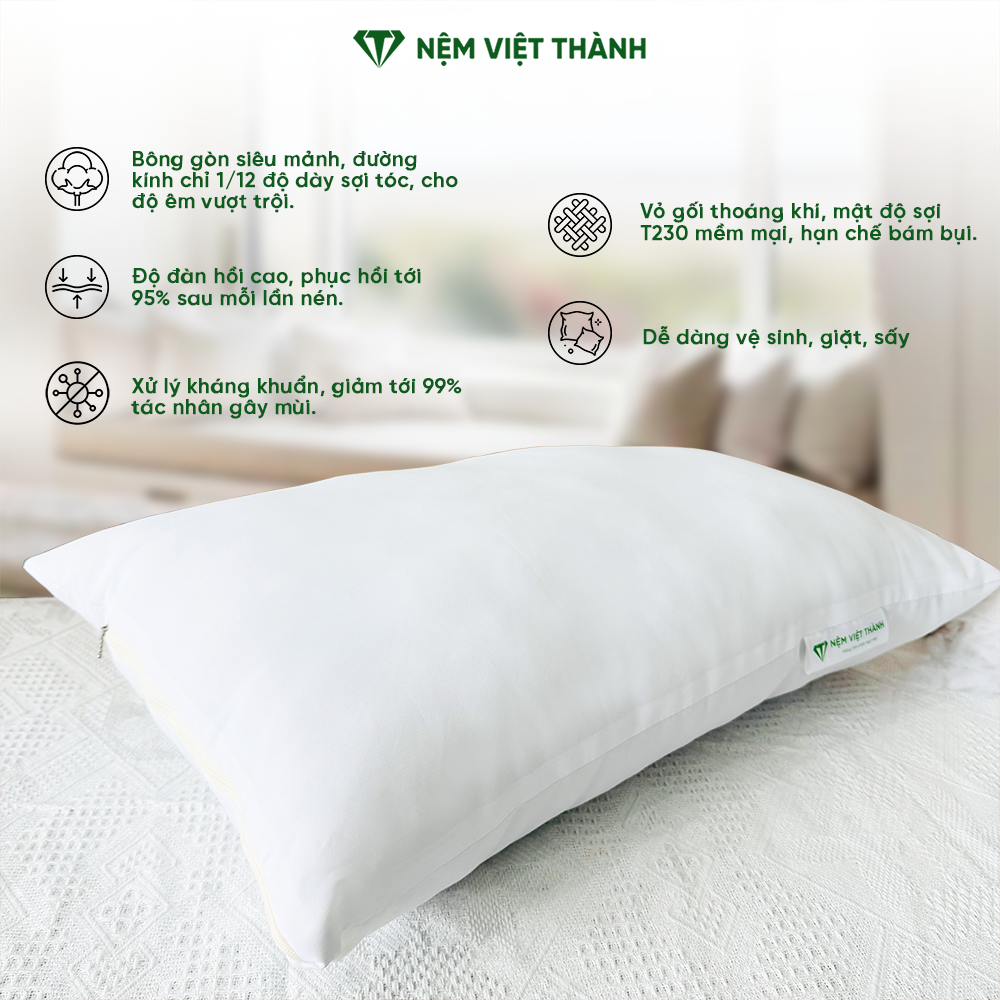 Cấu trúc gòn nhẹ kết hợp vỏ cotton thoáng mát, giúp ruột gối nằm gòn Việt Thành luôn khô ráo, thoải mái ngay cả khi sử dụng trong thời tiết nóng ẩm.